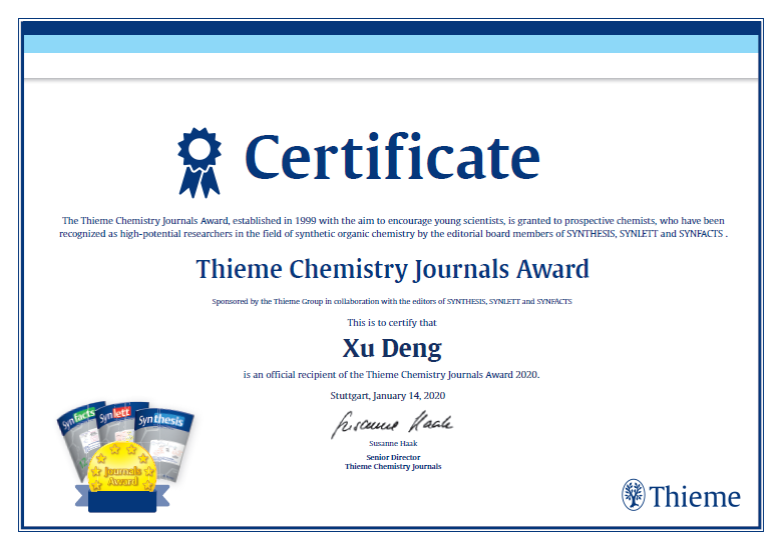近日,我校WG平台 邓旭副教授荣获2020年度“Thieme Chemistry Journal Award”国际学术奖。该奖项是由德国Thieme Group(德国蒂莫出版集团)于1999年首次设立,每年颁发一次,由德…