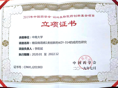 重大疾病小分子药物研究组的“糖尿病肾病1类创新药WZY-314的成药性研究”被大会推评为2019年中国药学会-以岭生物医药创新基金拟资助项目。