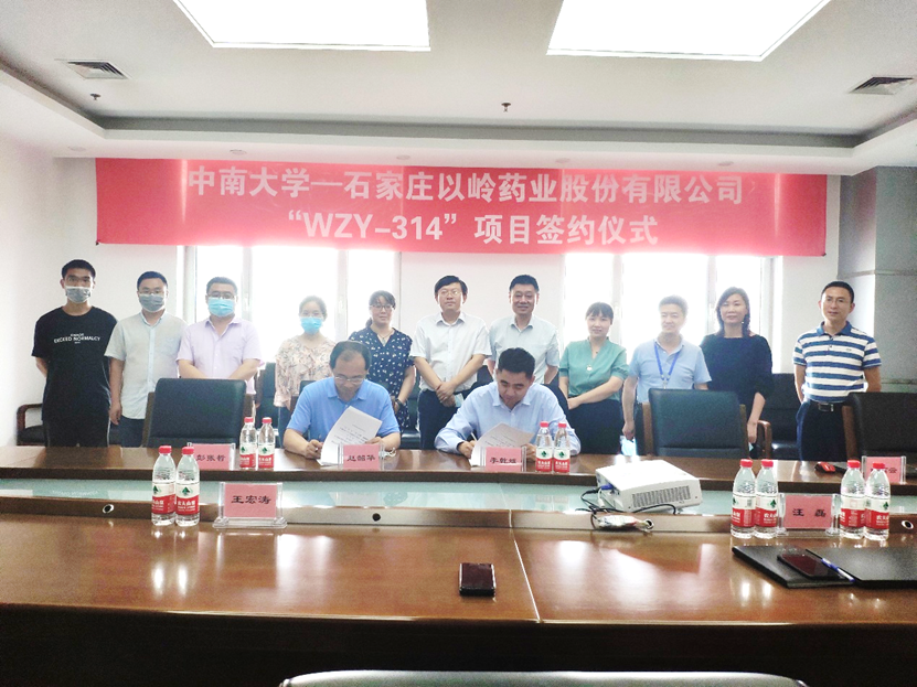 2020年6月15日,重大疾病小分子药物研究团队的胡高云教授、李乾斌教授和彭张哲副教授赴石家庄以岭药业进行签约,双方共同签署了WZY-314项目有关的转让合同,对前期研究材料进行了交接并就后续研究计划进行磋商。按照约定,以岭药业将在法定期限内就该成果申请国际PCT专利,并承担所有中国市场及国际市场后续开发工作,以岭药业将以里程碑现金加上市后提成的方式支付中南大学相关的转让费用。