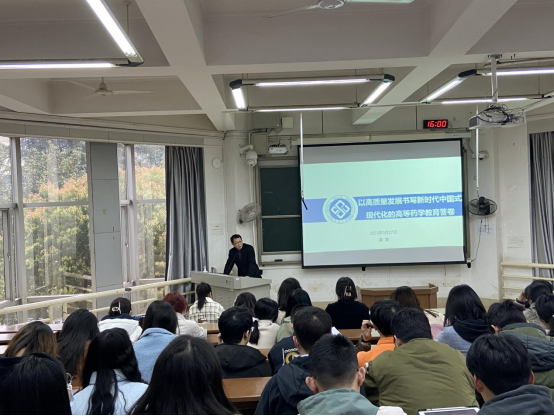 党委书记龚涛在福庆楼T211教室为师生们主讲“开学第一课”,带领全院本科生、研究生干部及2022级硕士和博士深刻领悟“以高质量发展书写新时代中国式现代化的高等药学教育答卷”,勉励同学们从“开学第一课”中汲取奋进能量,在行动中践行党的二十大精神。