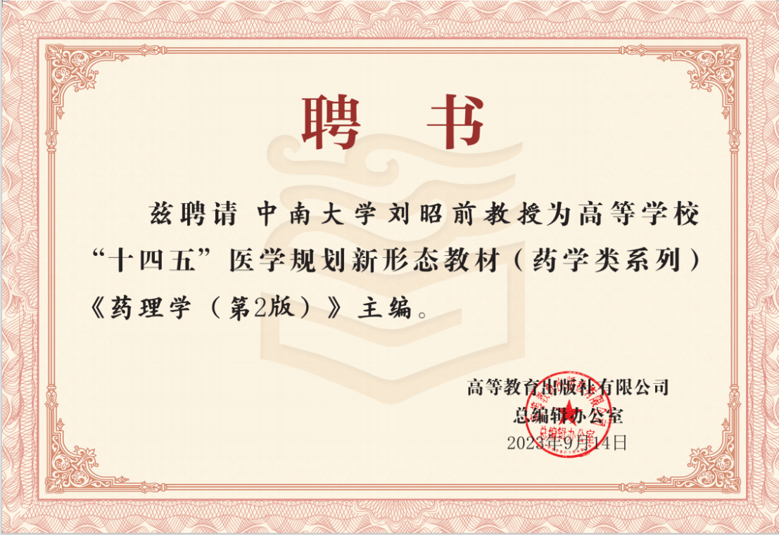 刘昭前教授为高等学校“十四五”医学规划新形态教材(药学类系列)《药理学》(第2版)主编。