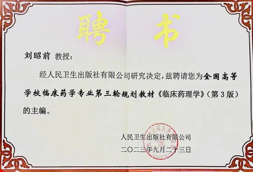 刘昭前教授为全国高等学校临床药学专业第三轮规划教材《临床药理学》(第3版)主编。