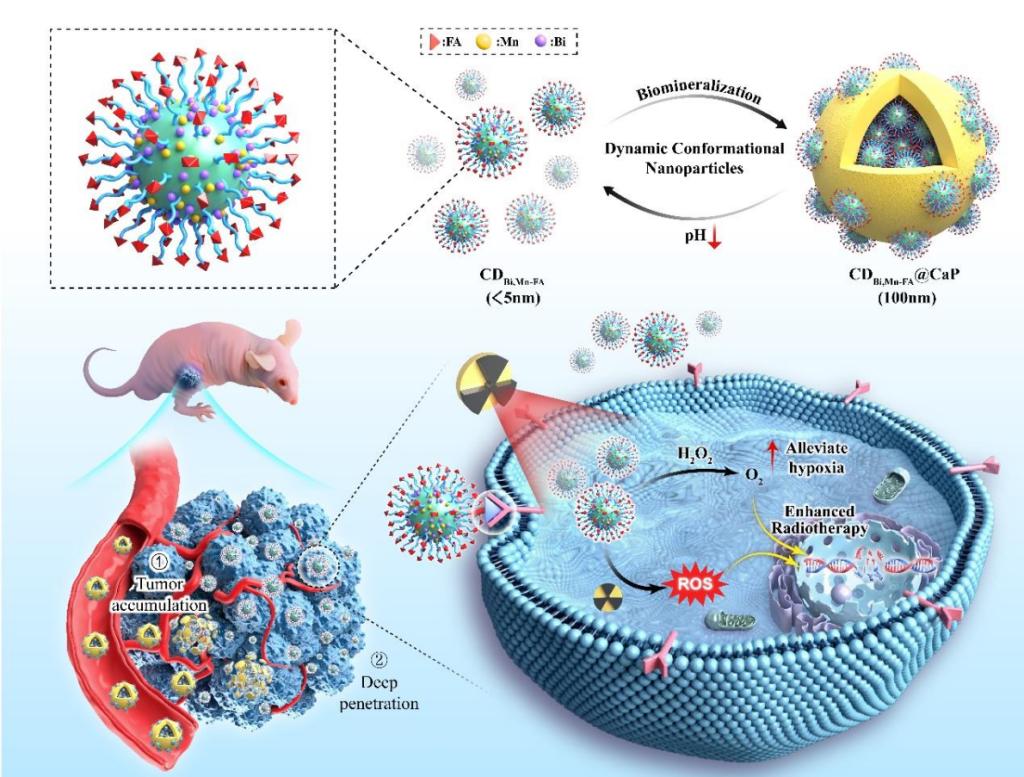 侯红帅教授团队在Chemical Engineering Journal(中科院1区Top期刊,IF=13.3)杂志上以Research Article形式联合发表题为“Bismuth/Manganese-Doped Carbon Dots in Calcium Phosphate Matrix: Dynamic Conformational Nanoparticles Enhancing Tumor Accumulation, Deep Penetration, and Radiosensitivity”的原创研究论文。周文虎教授、容鹏飞教授和侯红帅教授为论文共同通讯作者,博士研究生刘佳豪、李庆年和中南大学硕士毕业研究生屠焓钰(现为香港科技大学博士研究生)为论文第一作者,WG平台
