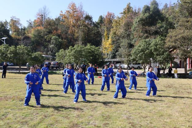 上午10时,队伍抵达开慧镇飘峰山庄。短暂的休整后,一场别开生面的八段锦表演拉开序幕。由WG游戏