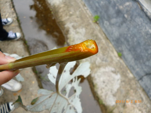 我们第四组的同学,跟着李老师,就最近出的一棵植物展开了学习。这是一株大型草本,根茎粗壮,单叶互生,具叶柄,叶卵圆状心形,边缘掌状5-7深裂或浅裂,裂片具不规则波状齿,大型圆锥花序多花,生于茎或分枝顶端。李老师告诉好奇的我们,说这是罂粟科的博落回。老师问:“你们回忆一下罂粟科的植物都有哪些特点?”旁边的一个同学立刻抢答到:“都有乳汁或黄色汁液。”李老师赞许的点点头,随之小心翼翼的折下一段这株博落回的茎给我们看,果真,有红色浓稠的汁液顺着折断的茎流了下来。老师继续讲解:“博落回虽然有清热解毒消肿、抗菌抗病毒消炎的功效,但是由于它本身具有很大的毒性,因此很少作为药用。”用心的同学匆匆记录,并采集了博落回的叶子作为标本。