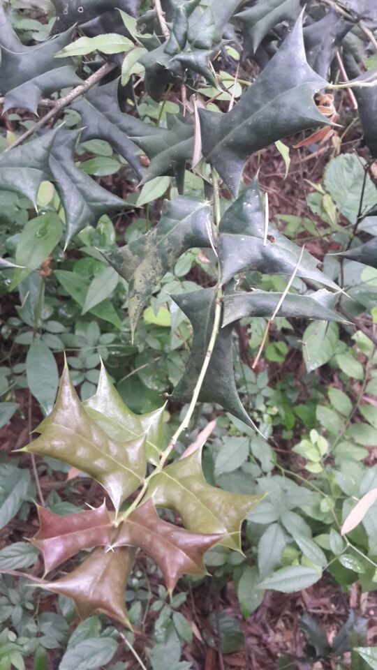 枸骨,主要是叶的形态,叶硬革质,矩圆形,顶端扩大并有3枚大尖硬刺齿。实验课上我们已经见过它,没想到野外实习又见到了它。