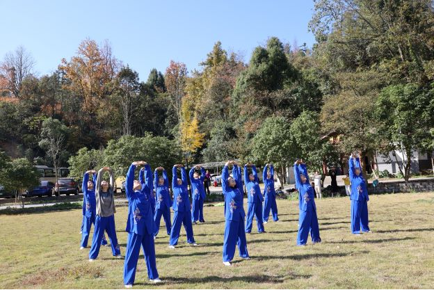 上午10时,队伍抵达开慧镇飘峰山庄。短暂的休整后,一场别开生面的八段锦表演拉开序幕。由WG游戏